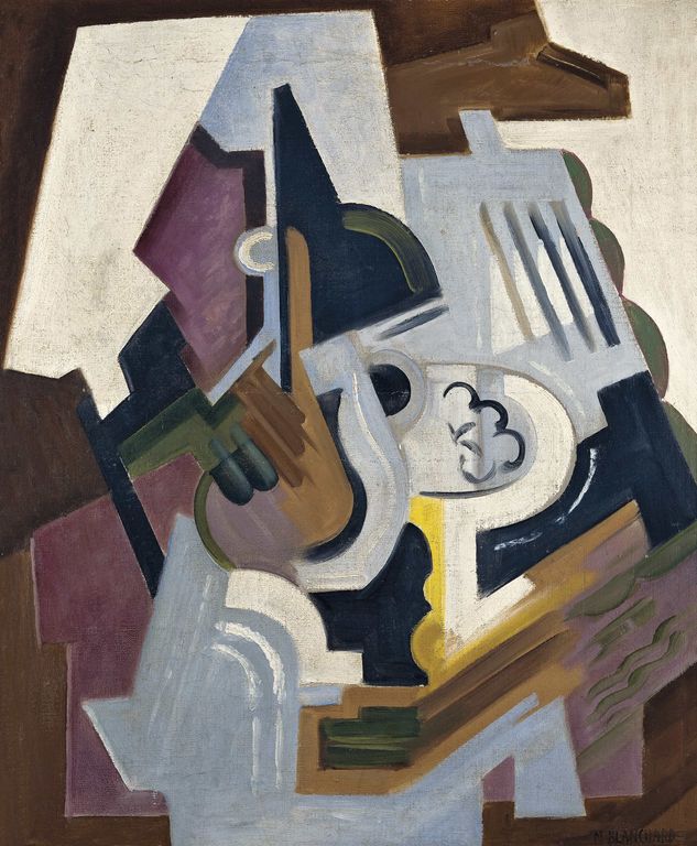 Cercana a la estela de Juan Gris (no seguidora del mismo como muchos han querido apuntar), el cubismo de Blanchard se caracteriza por la contención, las figuras planas y las formas austeras. Nunca llegó a la total descomposición de la forma, característica del cubismo analítico. También el dominio del color distingue su obra cubista de la de sus coetáneos. Leonce Rosenberg, su marchante —quien compró toda su producción cubista—, definía asía su personalísimo estilo: “tiene un brillo, una composición, una tonalidad más humana y menos científica”. De esta época cubista destacan cuadros como Mujer con abanico o Mujer con guitarra, ambas representativas de su personal disección de los objetos, en la que no desparece del todo la sombra de la figuración.